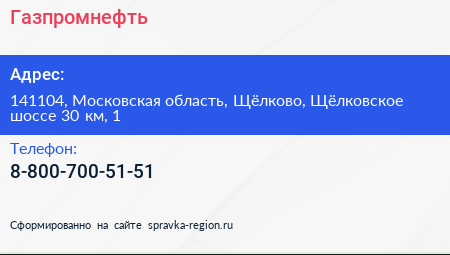 Газпромнефть по адресу 141104, Московская область, Щёлково, Щёлковское шоссе 30 км, 1 в дальнейшем Организация, размещена в следующих категориях: