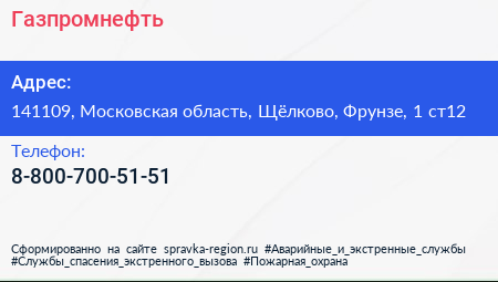 Газпромнефть по адресу 141109, Московская область, Щёлково, Фрунзе, 1 ст12 в дальнейшем Организация, размещена в следующих категориях: