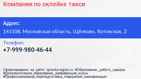 Компания по оклейке такси по адресу 141108, Московская область, Щёлково, Хотовская, 2 в дальнейшем Организация, размещена в следующих категориях: