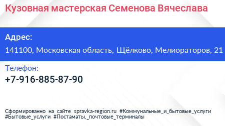 Кузовная мастерская Семенова Вячеслава по адресу 141100, Московская область, Щёлково, Мелиораторов, 21 в дальнейшем Организация, размещена в следующих категориях: