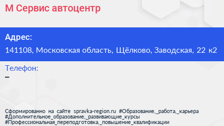 М-Сервис, автоцентр по адресу 141108, Московская область, Щёлково, Заводская, 22 к2 в дальнейшем Организация, размещена в следующих категориях: