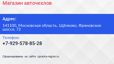 Магазин авточехлов по адресу 141100, Московская область, Щёлково, Фряновское шоссе, 72 в дальнейшем Организация, размещена в следующих категориях: