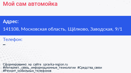 Мой сам, автомойка по адресу 141108, Московская область, Щёлково, Заводская, 9/1 в дальнейшем Организация, размещена в следующих категориях: