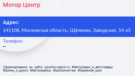Мотор-Центр по адресу 141108, Московская область, Щёлково, Заводская, 14 к3 в дальнейшем Организация, размещена в следующих категориях: