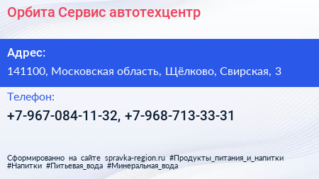 Орбита-Сервис, автотехцентр по адресу 141100, Московская область, Щёлково, Свирская, 3 в дальнейшем Организация, размещена в следующих категориях:
