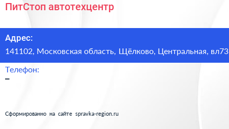 ПитСтоп, автотехцентр по адресу 141102, Московская область, Щёлково, Центральная, вл73 в дальнейшем Организация, размещена в следующих категориях: