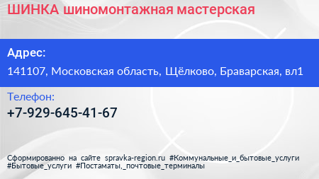 ШИНКА, шиномонтажная мастерская по адресу 141107, Московская область, Щёлково, Браварская, вл1 в дальнейшем Организация, размещена в следующих категориях: