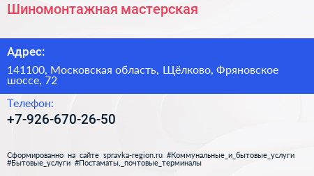 Шиномонтажная мастерская по адресу 141100, Московская область, Щёлково, Фряновское шоссе, 72 в дальнейшем Организация, размещена в следующих категориях: