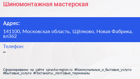 Шиномонтажная мастерская по адресу 141100, Московская область, Щёлково, Новая Фабрика, вл362 в дальнейшем Организация, размещена в следующих категориях: