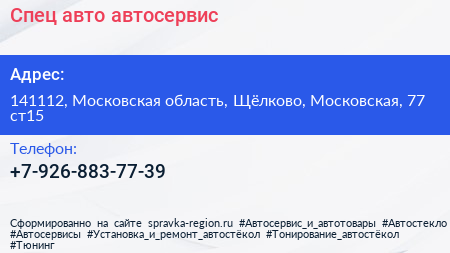 Спец-авто, автосервис по адресу 141112, Московская область, Щёлково, Московская, 77 ст15 в дальнейшем Организация, размещена в следующих категориях: