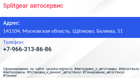 Splitgear, автосервис по адресу 141104, Московская область, Щёлково, Беляева, 51 в дальнейшем Организация, размещена в следующих категориях:
