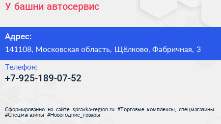 У башни, автосервис по адресу 141108, Московская область, Щёлково, Фабричная, 3 в дальнейшем Организация, размещена в следующих категориях: