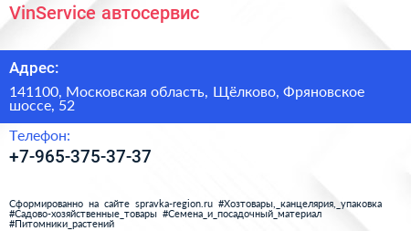 VinService, автосервис по адресу 141100, Московская область, Щёлково, Фряновское шоссе, 52 в дальнейшем Организация, размещена в следующих категориях: