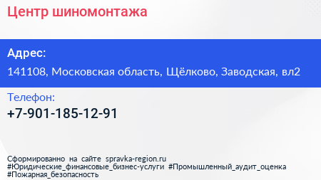 Центр шиномонтажа по адресу 141108, Московская область, Щёлково, Заводская, вл2 в дальнейшем Организация, размещена в следующих категориях: