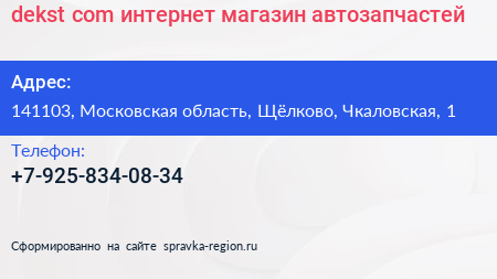 dekst.com, интернет-магазин автозапчастей по адресу 141103, Московская область, Щёлково, Чкаловская, 1 в дальнейшем Организация, размещена в следующих категориях:
