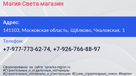 Магия Света, магазин по адресу 141103, Московская область, Щёлково, Чкаловская, 1 в дальнейшем Организация, размещена в следующих категориях: