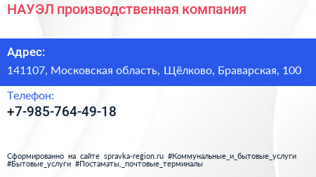 НАУЭЛ, производственная компания по адресу 141107, Московская область, Щёлково, Браварская, 100 в дальнейшем Организация, размещена в следующих категориях: