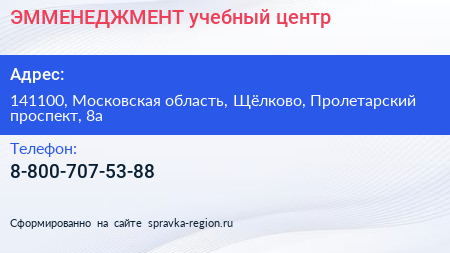 ЭММЕНЕДЖМЕНТ, учебный центр по адресу 141100, Московская область, Щёлково, Пролетарский проспект, 8а в дальнейшем Организация, размещена в следующих категориях: