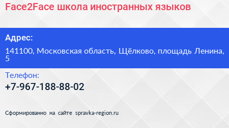 Face2Face, школа иностранных языков по адресу 141100, Московская область, Щёлково, площадь Ленина, 5 в дальнейшем Организация, размещена в следующих категориях: