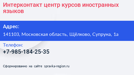 Интерконтакт, центр курсов иностранных языков по адресу 141103, Московская область, Щёлково, Супруна, 1а в дальнейшем Организация, размещена в следующих категориях: