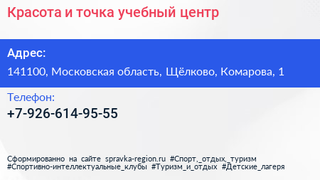 Красота и точка, учебный центр по адресу 141100, Московская область, Щёлково, Комарова, 1 в дальнейшем Организация, размещена в следующих категориях: