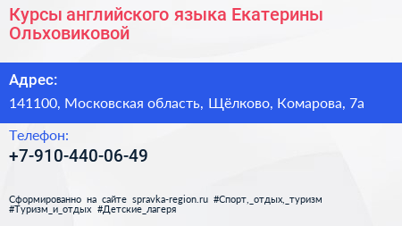 Курсы английского языка Екатерины Ольховиковой по адресу 141100, Московская область, Щёлково, Комарова, 7а в дальнейшем Организация, размещена в следующих категориях:
