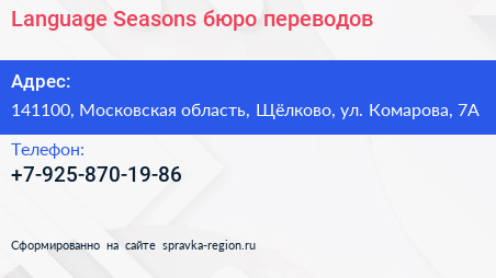 Language Seasons, бюро переводов по адресу 141100, Московская область, Щёлково, ул. Комарова, 7А в дальнейшем Организация, размещена в следующих категориях: