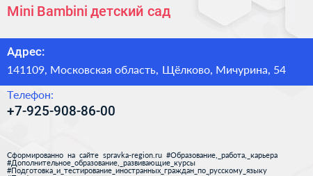 Mini Bambini, детский сад по адресу 141109, Московская область, Щёлково, Мичурина, 54 в дальнейшем Организация, размещена в следующих категориях: