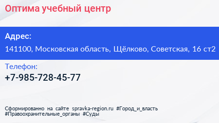 Оптима, учебный центр по адресу 141100, Московская область, Щёлково, Советская, 16 ст2 в дальнейшем Организация, размещена в следующих категориях: