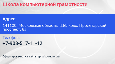 Школа компьютерной грамотности по адресу 141100, Московская область, Щёлково, Пролетарский проспект, 8а в дальнейшем Организация, размещена в следующих категориях:
