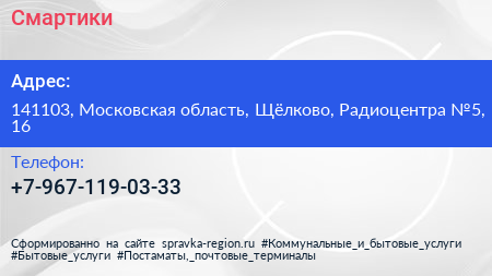 Смартики по адресу 141103, Московская область, Щёлково, Радиоцентра №5, 16 в дальнейшем Организация, размещена в следующих категориях: