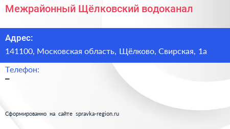 Межрайонный Щёлковский водоканал по адресу 141100, Московская область, Щёлково, Свирская, 1а в дальнейшем Организация, размещена в следующих категориях: