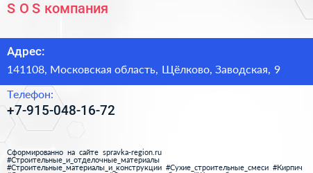 S.O.S, компания по адресу 141108, Московская область, Щёлково, Заводская, 9 в дальнейшем Организация, размещена в следующих категориях: