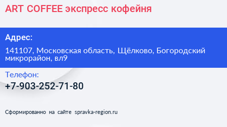 ART COFFEE, экспресс-кофейня по адресу 141107, Московская область, Щёлково, Богородский микрорайон, вл9 в дальнейшем Организация, размещена в следующих категориях: