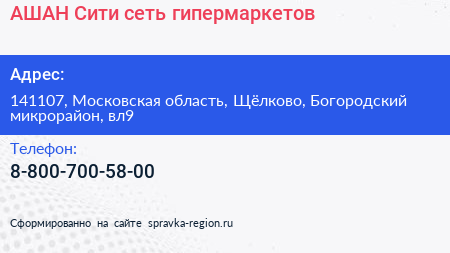 АШАН Сити, сеть гипермаркетов по адресу 141107, Московская область, Щёлково, Богородский микрорайон, вл9 в дальнейшем Организация, размещена в следующих категориях: