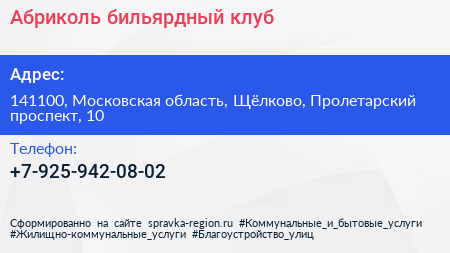 Абриколь, бильярдный клуб по адресу 141100, Московская область, Щёлково, Пролетарский проспект, 10 в дальнейшем Организация, размещена в следующих категориях: