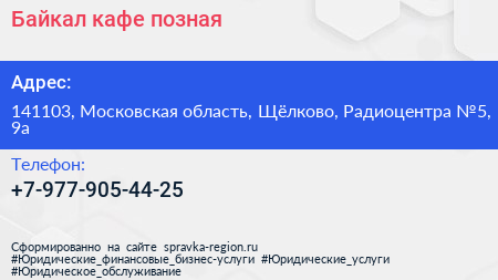 Байкал, кафе-позная по адресу 141103, Московская область, Щёлково, Радиоцентра №5, 9а в дальнейшем Организация, размещена в следующих категориях: