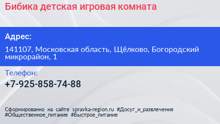 Бибика, детская игровая комната по адресу 141107, Московская область, Щёлково, Богородский микрорайон, 1 в дальнейшем Организация, размещена в следующих категориях:
