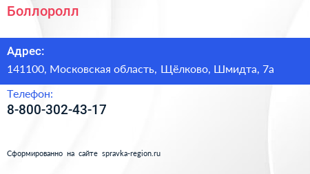 Боллоролл по адресу 141100, Московская область, Щёлково, Шмидта, 7а в дальнейшем Организация, размещена в следующих категориях: