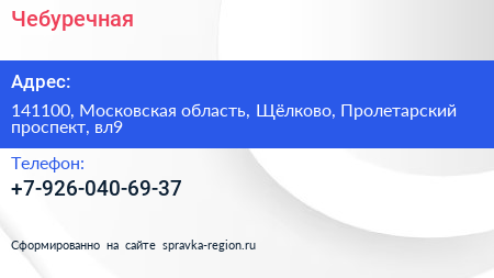 Чебуречная по адресу 141100, Московская область, Щёлково, Пролетарский проспект, вл9 в дальнейшем Организация, размещена в следующих категориях: