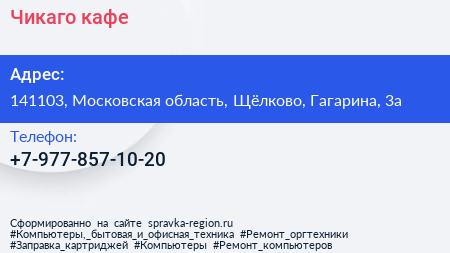 Чикаго, кафе по адресу 141103, Московская область, Щёлково, Гагарина, 3а в дальнейшем Организация, размещена в следующих категориях: