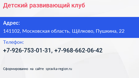 Детский развивающий клуб по адресу 141102, Московская область, Щёлково, Пушкина, 22 в дальнейшем Организация, размещена в следующих категориях: