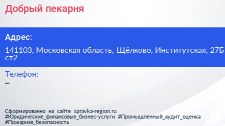 Добрый, пекарня по адресу 141103, Московская область, Щёлково, Институтская, 27Б ст2 в дальнейшем Организация, размещена в следующих категориях:
