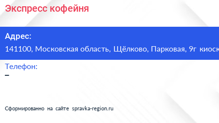 Экспресс-кофейня по адресу 141100, Московская область, Щёлково, Парковая, 9г киоск в дальнейшем Организация, размещена в следующих категориях: