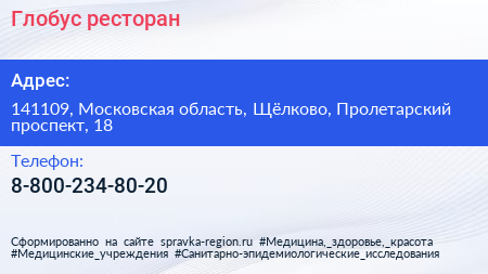 Глобус, ресторан по адресу 141109, Московская область, Щёлково, Пролетарский проспект, 18 в дальнейшем Организация, размещена в следующих категориях: