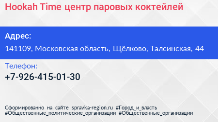 Hookah Time, центр паровых коктейлей по адресу 141109, Московская область, Щёлково, Талсинская, 44 в дальнейшем Организация, размещена в следующих категориях:
