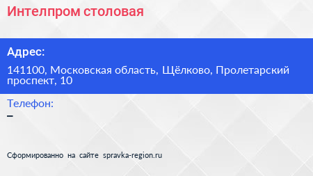 Интелпром, столовая по адресу 141100, Московская область, Щёлково, Пролетарский проспект, 10 в дальнейшем Организация, размещена в следующих категориях: