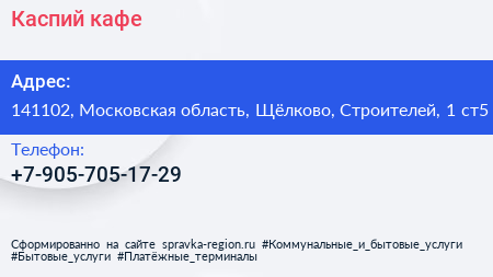 Каспий, кафе по адресу 141102, Московская область, Щёлково, Строителей, 1 ст5 в дальнейшем Организация, размещена в следующих категориях: