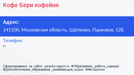 Кофе Бери, кофейня по адресу 141100, Московская область, Щёлково, Парковая, 12Б в дальнейшем Организация, размещена в следующих категориях: