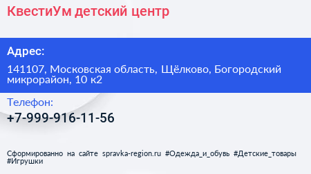 КвестиУм, детский центр по адресу 141107, Московская область, Щёлково, Богородский микрорайон, 10 к2 в дальнейшем Организация, размещена в следующих категориях: